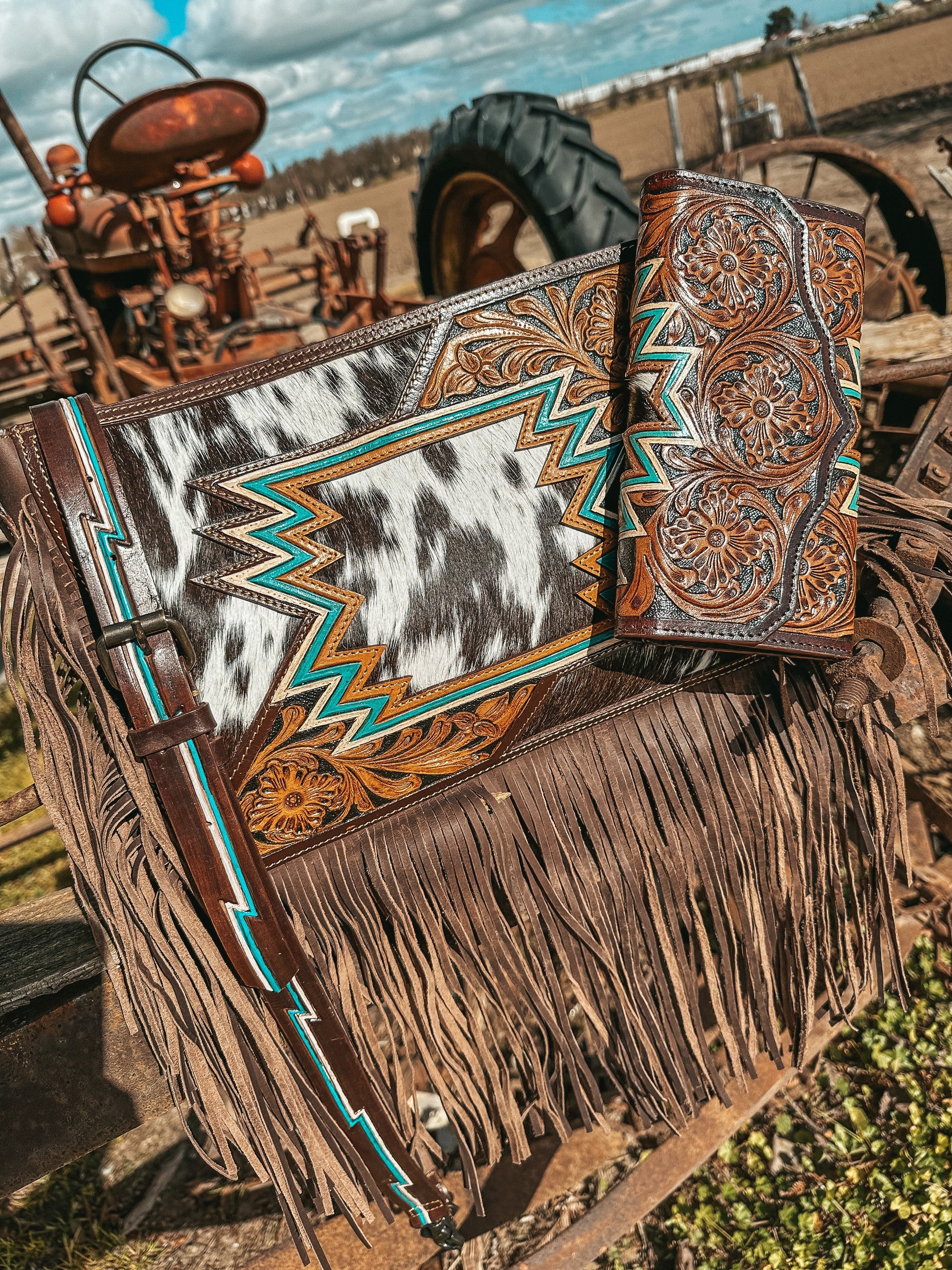 Introducing The Cowgirl Ziggy, a Haute Southern Hyde by Beth Marie Exclusive Cowhide Purse. This is an eye-grabber, with a unique Aztec tooling you aren’t going to see anywhere else.